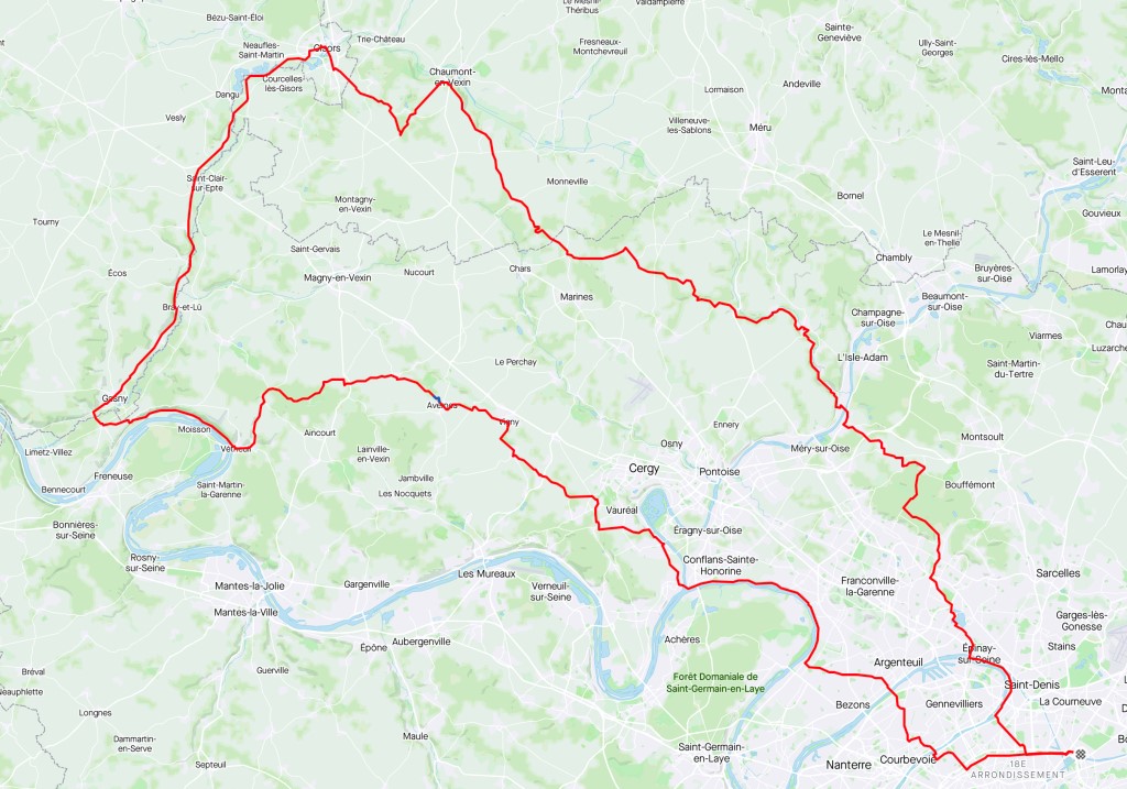 où nous retirons nos cartes de contrôles, notre gourde Victor, une barre énergétique maison et une banane et nous voilà presque parties. Christiane et Séverine sont escortées de deux journalistes de Femme Actuelle qui font un reportage sur les cyclistes « de plus de 50 ans ». Dans la queue je fais connaissance d’une expérimentée BRMeuse qui demande à se joindre à notre peloton car elle n’a pas de GPS et l’allure d’Anne et Christiane lui convient. Didier arrive juste à temps pour se joindre à notre petit groupe, nous partons dans foulée d’un groupe d’ambassadrices de la marque LIV. Jusqu’à Conflans les vélos roulent tout seul du boulevard des Maréchaux aux pistes cyclables de Levallois, c’est plat et le peu de circulation nous permet de gérer les feux avec élégance mais sans désinvolture. A Conflans un petit arrêt « Café-toilettes » et c’est reparti pour notre premier contrôle à la Roche Guyon. Évidemment, tant que c’est plat je fais illusion, mais dès la première bosse un peu sérieuse à Vauréal je décroche. Ce n’est pas très grave, je rencontre « Pauline » une grande bringue sympathique qui pendant la semaine exerce ses talents en faisant des livraisons à vélo. Nous papotons un bout de route jusqu’à ce qu’a un rond-point,